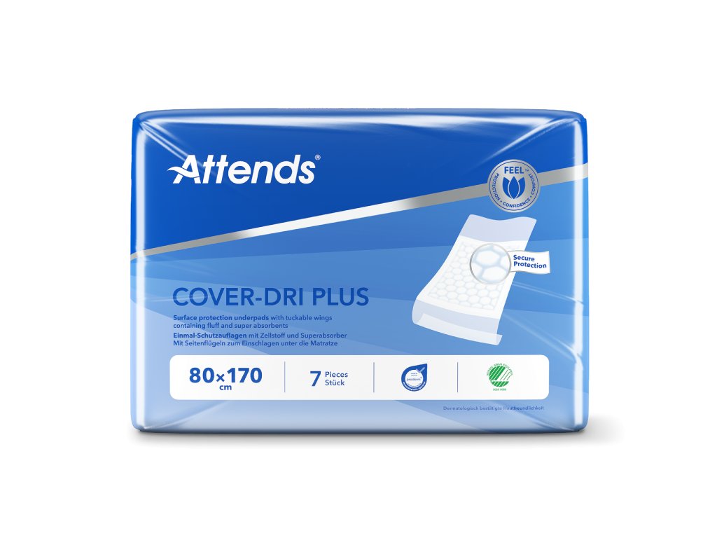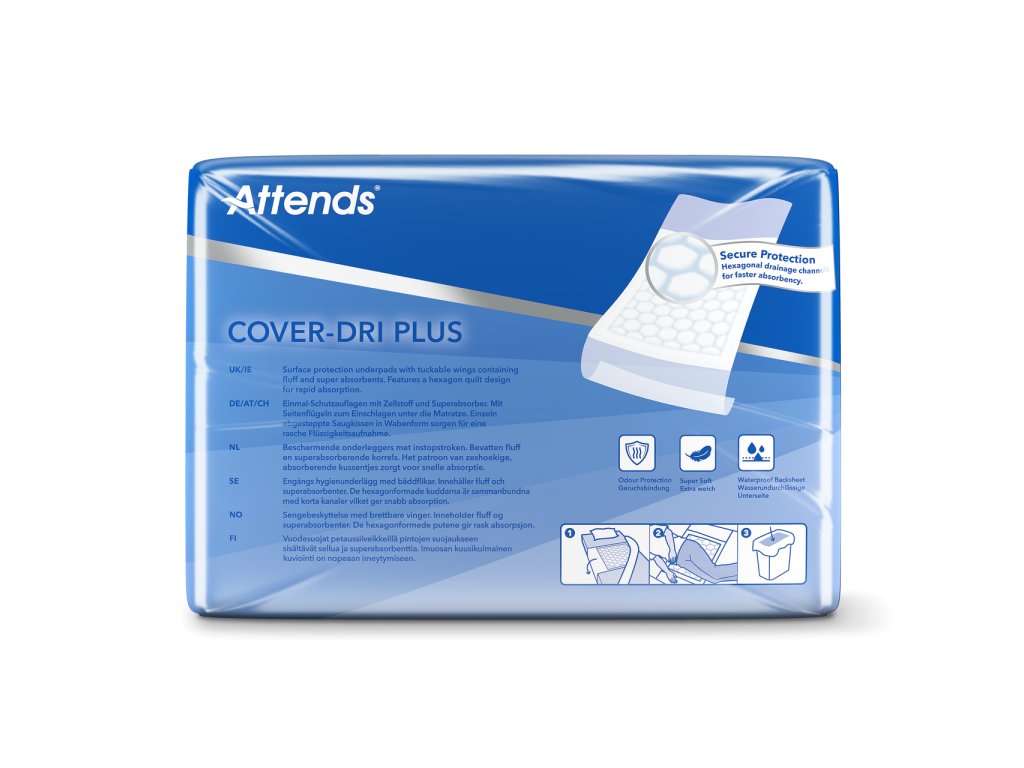 Attends Cover-Dri Plus je ochranná podložka, která se používá pro střední až těžkou inkontinenci moče. Absorpční šestiúhelníkové polštářky rychle a rovnoměrně absorbují kapalinu a zabraňují tak jejímu úniku. Doplňková ochrana lůžek, matrací, křesel, invalidních vozíků. Po použití vyhoďte do odpadu.